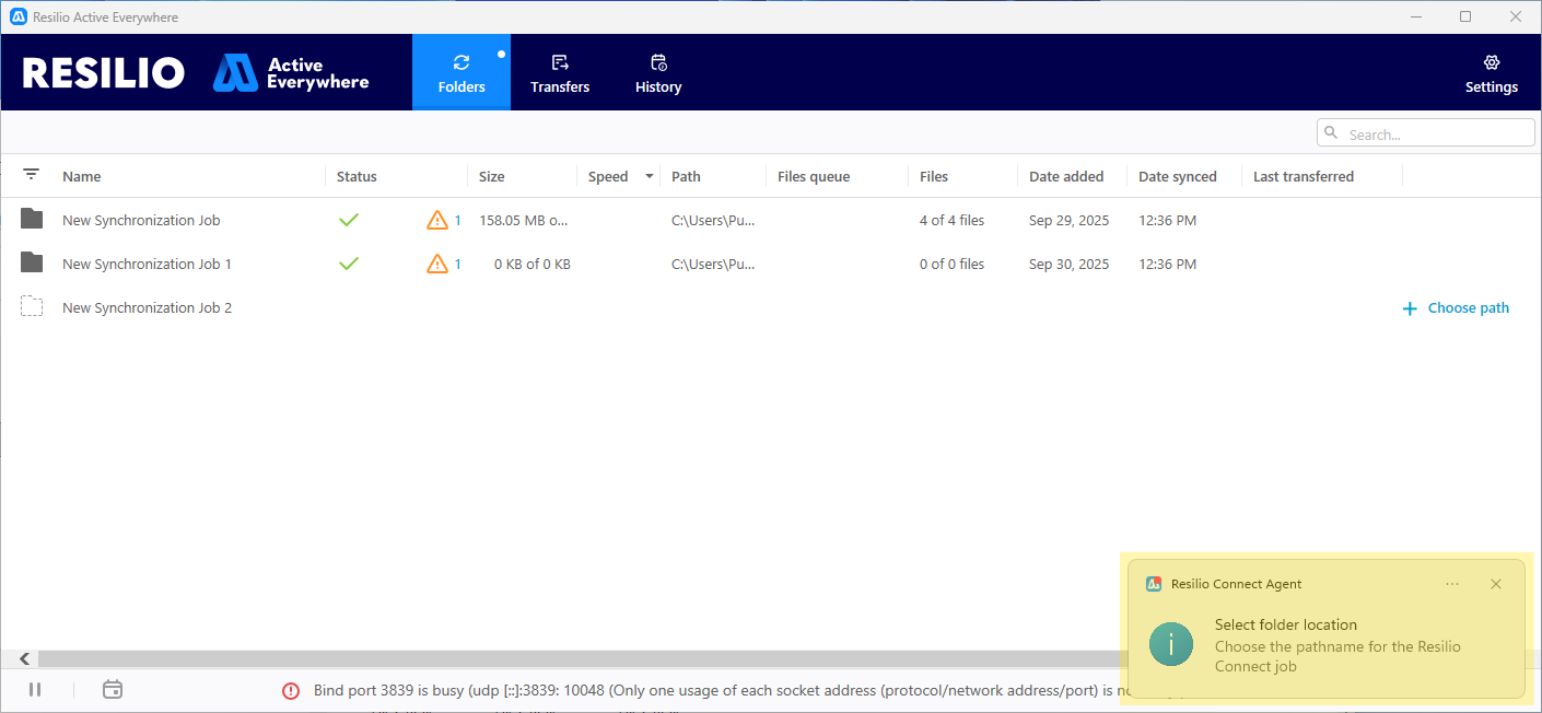 Until user chooses a directory, the agent reports "path not selected" status in the job run.