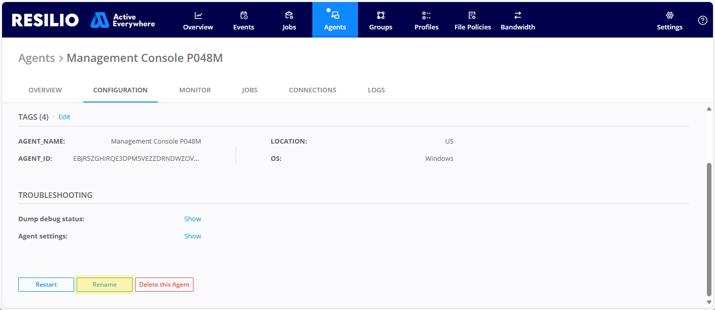 When renaming an Agent, its tag AGENT_NAME is updated accordingly. Name also changes in Agent UI. There are two ways to change the name of Agent - through the Agent's configuration file, or from Management Console UI.