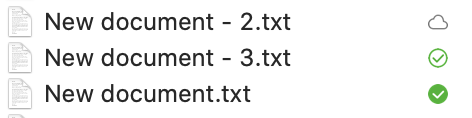 These Finder icons are only present on files, not subdirectories. A fully synced file will be always present on the device. If a file is updated on a remote Agent, it will be automatically synced here and the previous version will be placed in the Archive folder. Such files are not cleared by the "Cleanup timeout" Profile setting. The flag is preserved if file is edited in the virtual folder in most cases, or if synchronization of NTFS or Posix permissions is enabled in Agent profile. File's state is changed to 'file version '. Click on "Always keep synced" context menu again to keep it synced automatically. If a file is fetched by an application, only the current version is stored on the device. It also means that if file changes on a remote Agent, it will become dehydrated but that file version will be placed to Archive. Files that are added to a TSS folder locally store only the current version. Dehydrated files don't take space. |