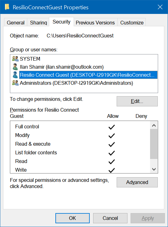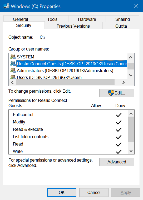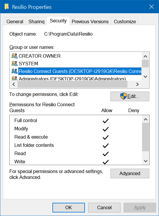 Allow the “Resilio Connect Guests” Group full control over the Resilio settings folder (typically \ProgramData\Resilio). Deny the “Resilio Connect Guests” Group from accessing the C: drive (and any other sensitive drive)