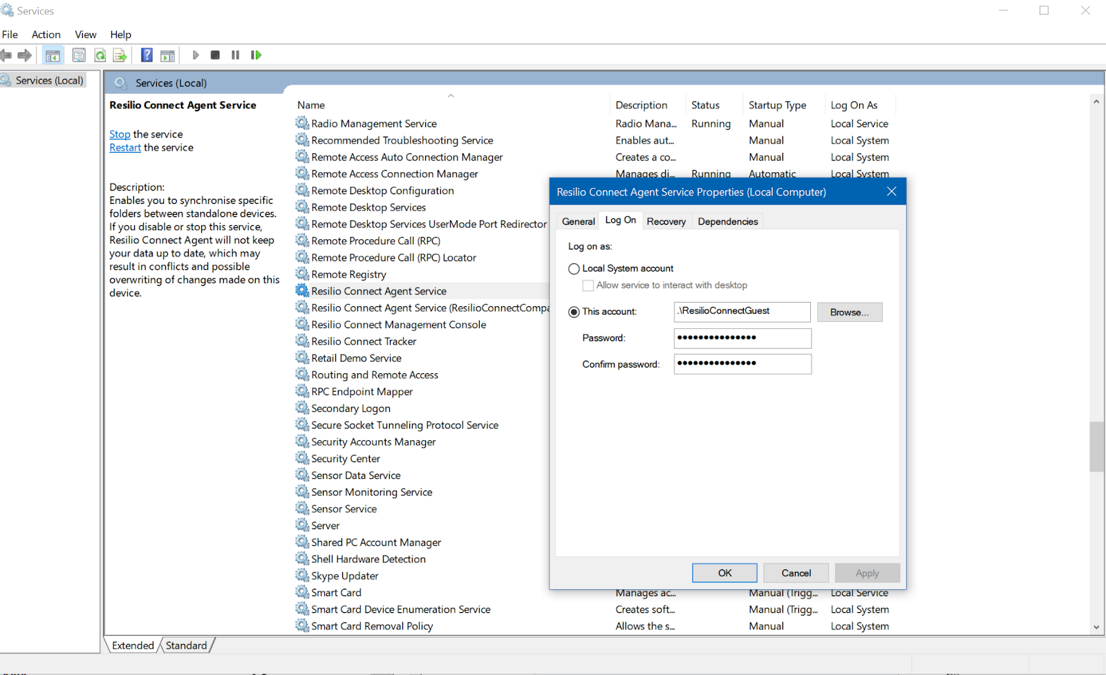 The Resilio Agent Service should be configured to run with the ResilioConnectGuest user credentials.