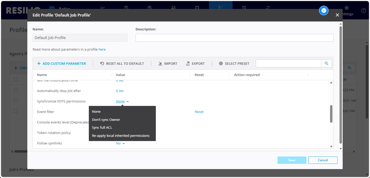 To change the NTFS permission synchronization mode, edit the Job Profile and update the Synchronize NTFS permissions parameter's value accordingly.