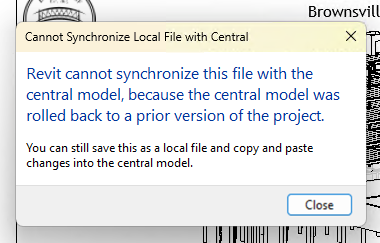- Save local model to temporary local model, reopen central model and copy latest changes to central model.
