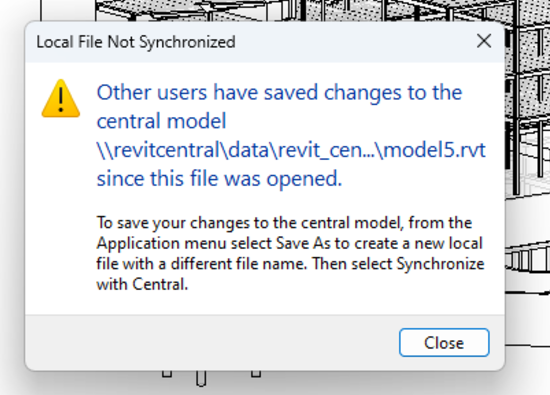 During sync, if one site updates the central model, the other site's users must wait for Resilio to replicate changes before syncing local model with central. While the message is being presented, Revit retries accessing the files, and once it successfully access files the message disappears and the model is synced correctly.