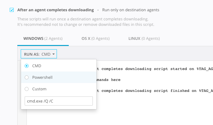 Available from v4.1.0 and only for Agents v4.1.0 and newer. Executed by each destination Agent right after it downloads all the files (not counting the pre-seeded files). If this trigger is enabled, the Agent downloads file to a temp directory, and after executing the script moves them to their locations.