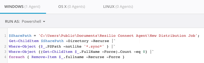 Resilio Connect v2.5.2 and newer gives the choice of shells for executing scripts - either in transfer jobs or in a Script job - Powershell and CMD for Windows, Shell for unix. For each platform custom shell is also available.