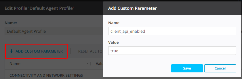 To enable Agent API for an agent, add the client_api_enabled custom parameter with a value true to an Agent Profile.