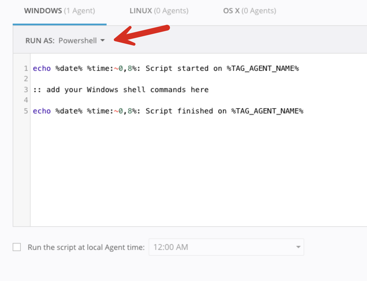 - Under the Script section, select Run AS Powershell