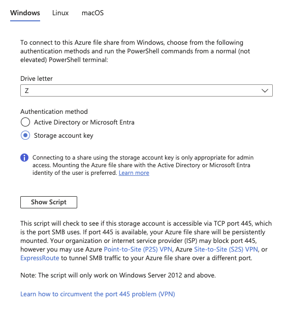- Pick Windows and Storage Account Key.