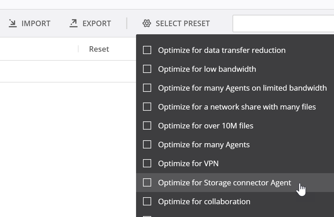 It's also possible to create your own non-default profile. Give it a recognizable name and apply the Cloud Storage preset. Note, the selected preset is not visibly marked in UI, but new non-default settings appear in the Profile. After that apply it to the group with the agent.