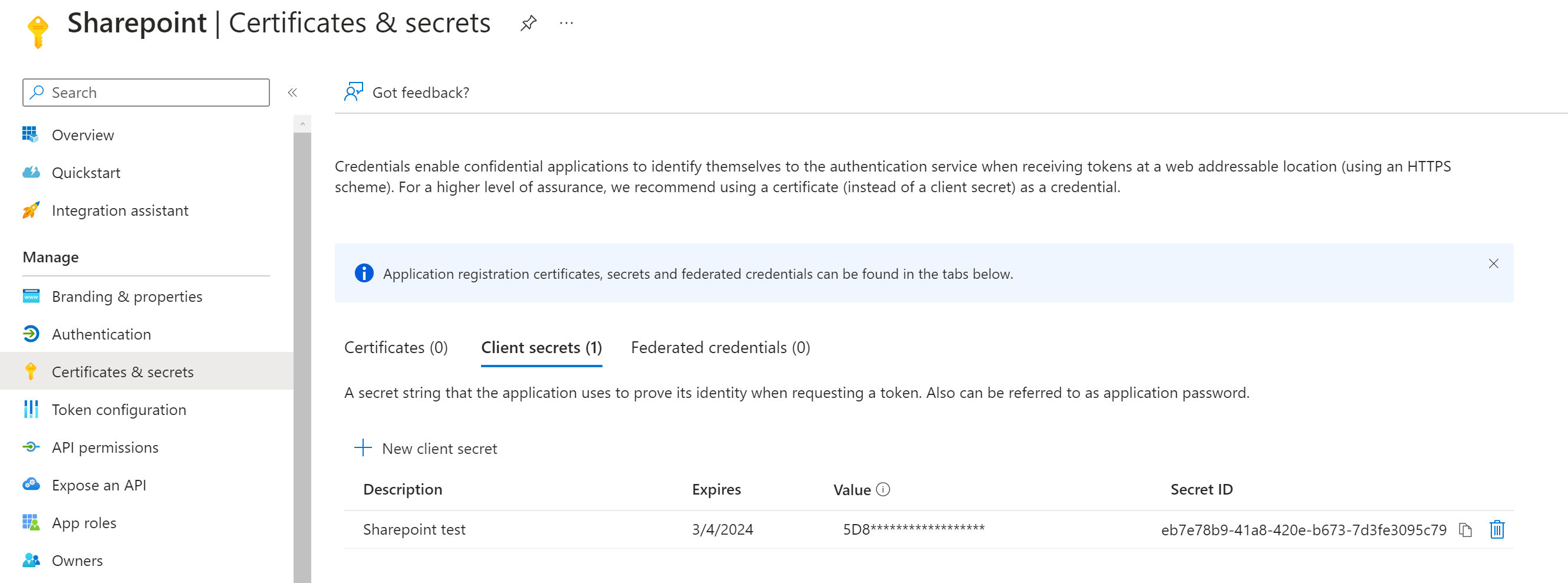 Create a new application. Be sure to save Client secret value. Application ID and Client secret value will be needed later when configuring connector in the Management Console