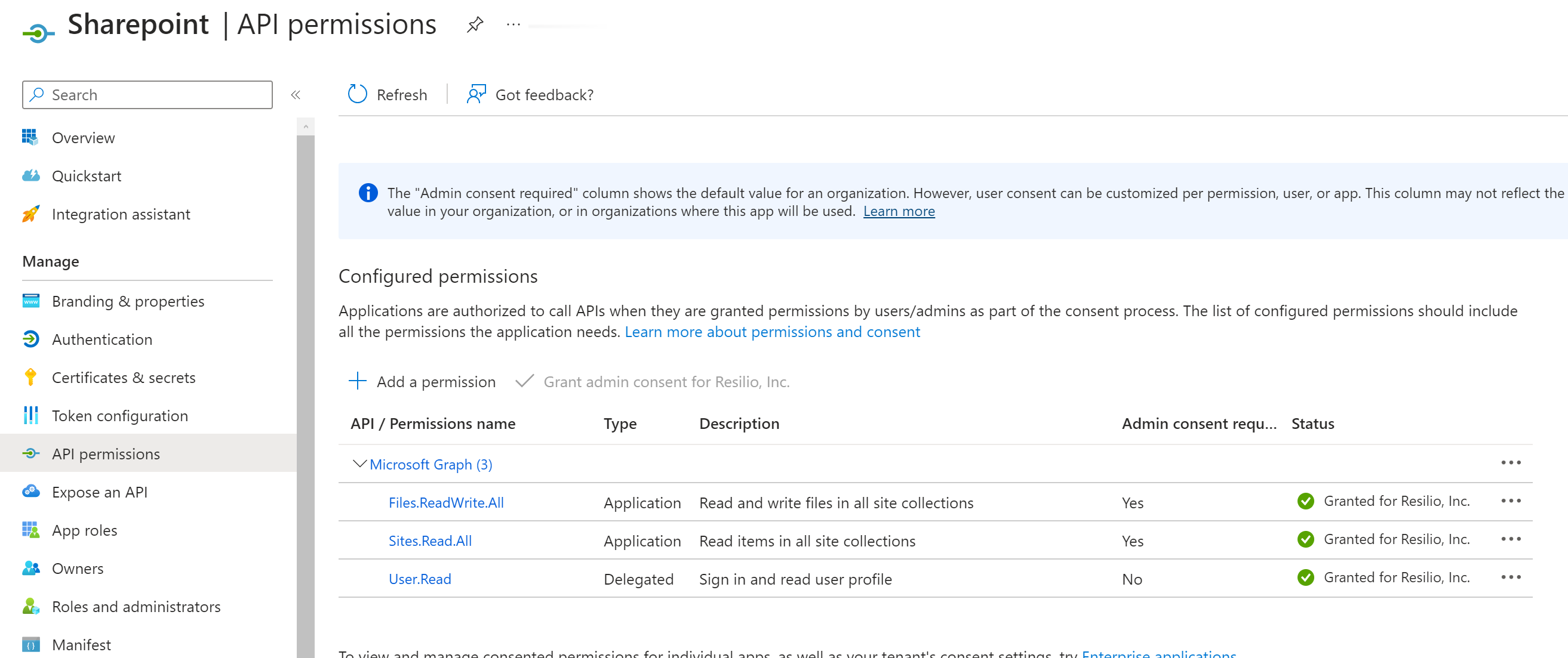 https://portal.azure.com/#view/Microsoft_AAD_RegisteredApps/ApplicationsListBladeMicrosoft Graph ‘Application’ level permissions Files.ReadWrite.All, Sites.Read.All, User.Read should be granted.