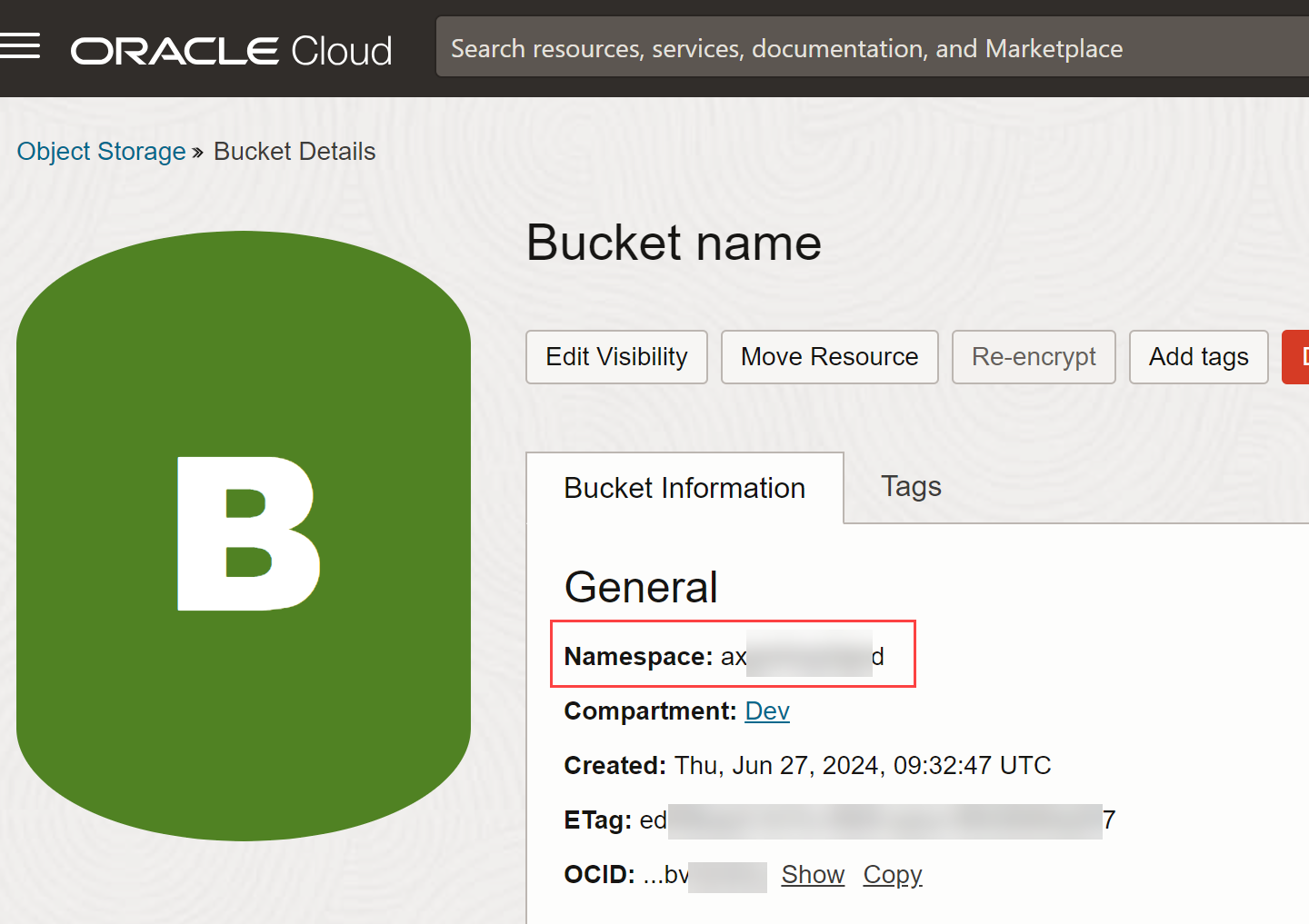 Namespace. The namespace is available in the bucket info. Alternatively, it’s available on the tenancy page if the user has sufficient privileges. Provide in format