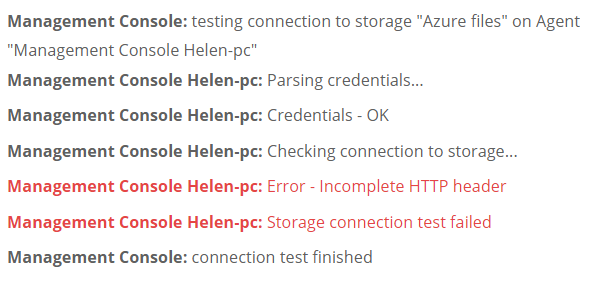 If a connection to the cloud is not possible for any reason, the agent will display the error returned by the cloud storage provider.