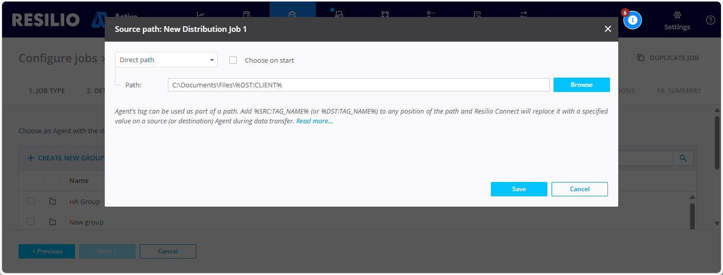 Create a new tag on Agents tab, give it a name and value. Value can be either absolute or relative path (just a subfolder). When using tags in path, tag prefix SRC or DST are required for distribution and consolidation Jobs, not required for script Jobs. When specifying the path upon Job creation use the created tag as %SRC:TAG_NAME% or %DST:TAG_NAME%. These prefixes will resolve the tag into the path for source or destination agents accordingly.