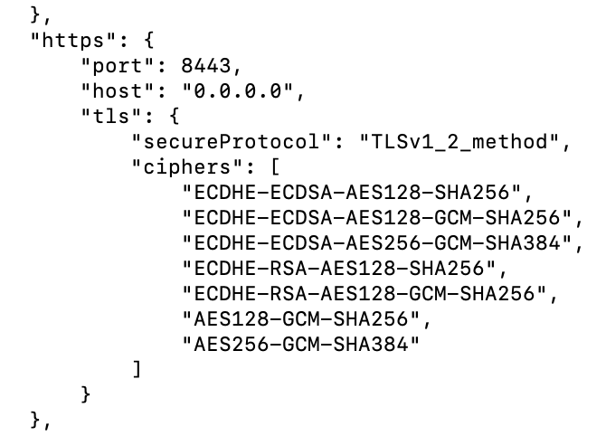 "tls": { "secureProtocol": "TLSv1_2_method", "ciphers": [ "ECDHE-ECDSA-AES128-SHA256", "ECDHE-ECDSA-AES128-GCM-SHA256", "ECDHE-ECDSA-AES256-GCM-SHA384", "ECDHE-RSA-AES128-SHA256", "ECDHE-RSA-AES128-GCM-SHA256" ] } -
