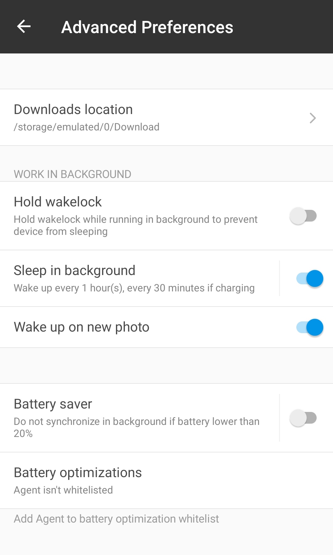 At wakeup periods, the Agent needs to sync all the files it discovers. Enable option "Hold wakelock" so that the Agent can continue working in background and is not force-stopped by the system. For this purpose it's also advisable to add the Agent to battery whitelist (warning: battery consumption may be high!).