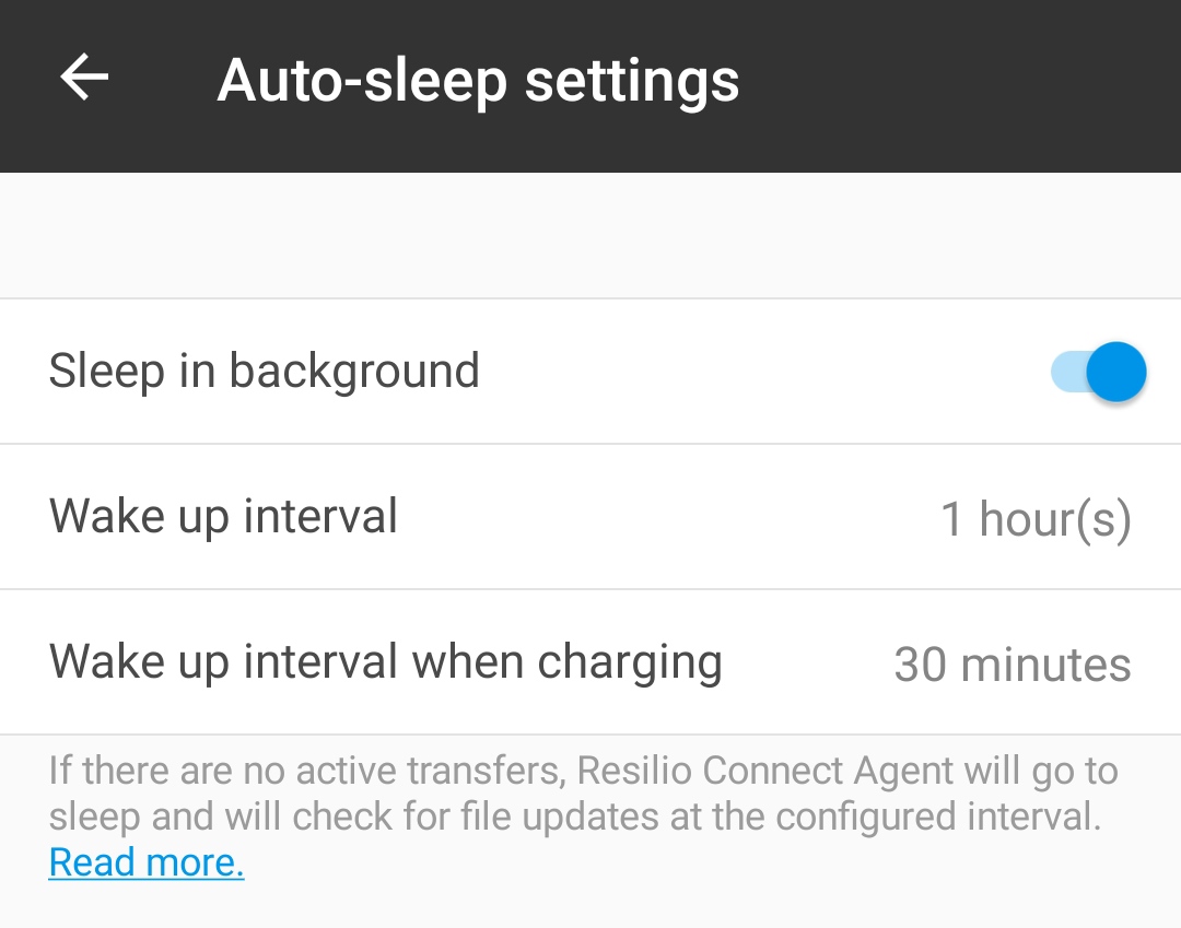 Enabling automatic sleep for an Agent will save its battery and can be used when the Android Agent is not expected to sync files frequently. Configuration can be found in Resilio Connect Agent settings -> Advanced. It cannot be configured from the Management Console.