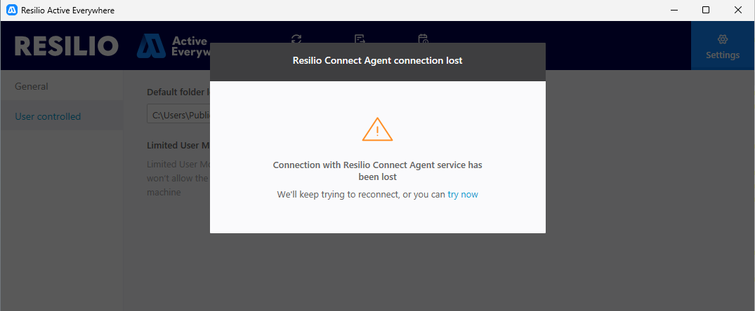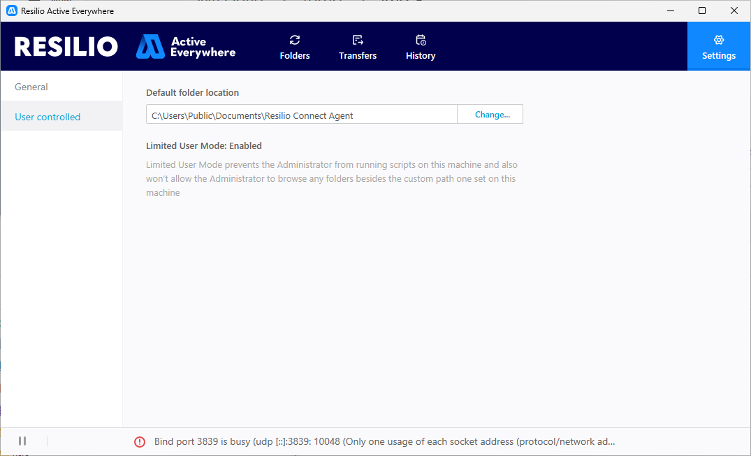 User controlled: allows to manage the behavior of the Agent independently of Resilio Admin. However, this is only if allowed from the Agent's Profile. For more information on bandwidth scheduler, see Bandwidth scheduler and pausing in the Resilio Agent UI. For more information on default folder location, see Limiting Admin Access To The Agent .