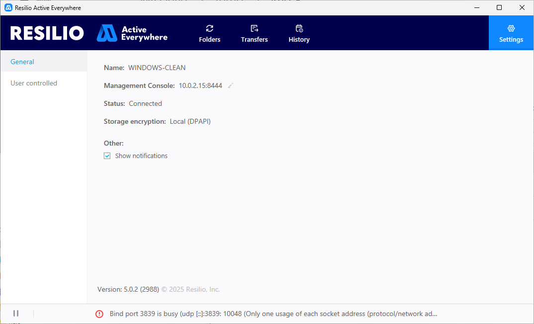 Agent user-interface is html based. It has tabs: Folders, Transfers , History and Options. Folders tab lists the sync shares and shows their status. Transfers tab shows transfer job runs (distribution and Consolidation) and Script jobs. History is the list of events for this agent, it’s a good source to trace the syncing activity for the last 30 days (or last 20K of events). Options keep some of changeable settings: device name, connectivity to the Management Console, bandwidth scheduler, default folder location and permissions for the MC Admin.