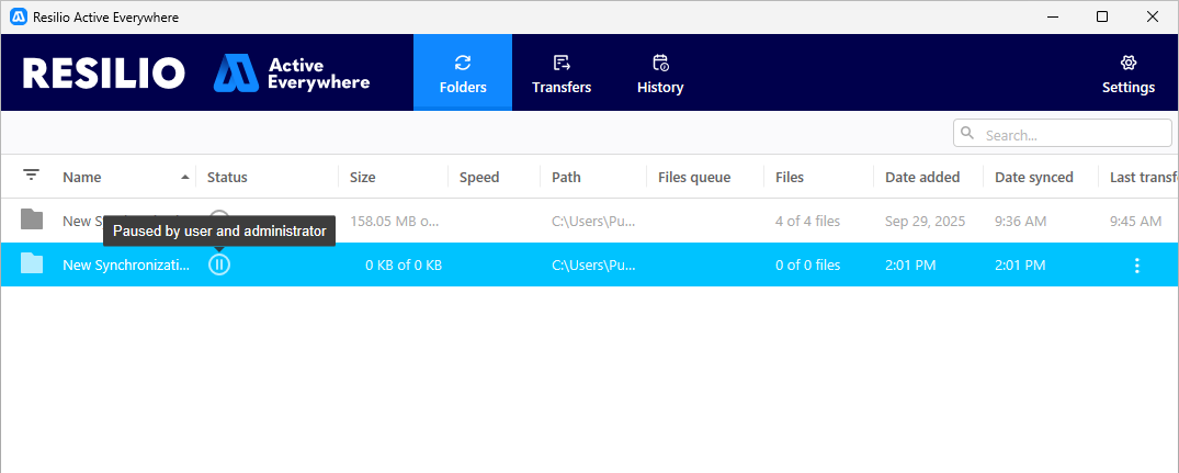 If user pauses agent in user-interface, pause tooltip says ‘Paused by user’. If agent is paused by Scheduled in MC, tooltip says “Paused by admin”. These two pauses interlap. For more information, see Bandwidth scheduler and pausing in the Resilio Agent UI.