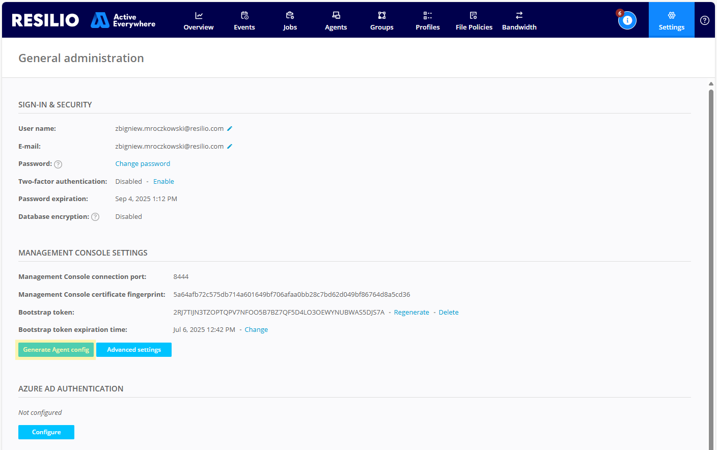 From the Settings menu, select General and in the MANAGEMENT CONSOLE SETTINGS section, click Generate Agent config.