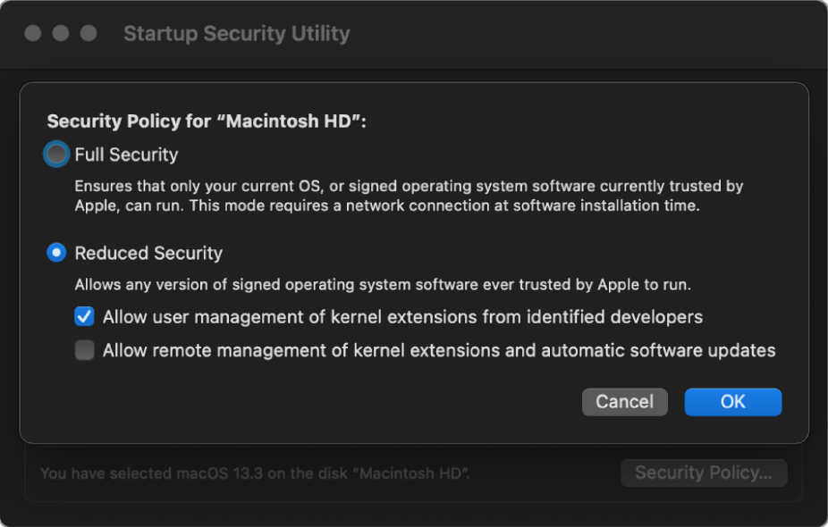 Reduced Security -> Allow user management of kernel extensions from identified
