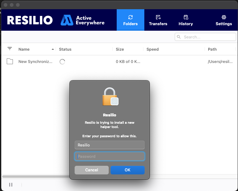 Resilio Agent additionally requires permissions to install helper tools, which is safe. The tool is used to mount and manage the virtual folder on the file system. No more action is required apart from providing the password for installation of helper tool to complete.