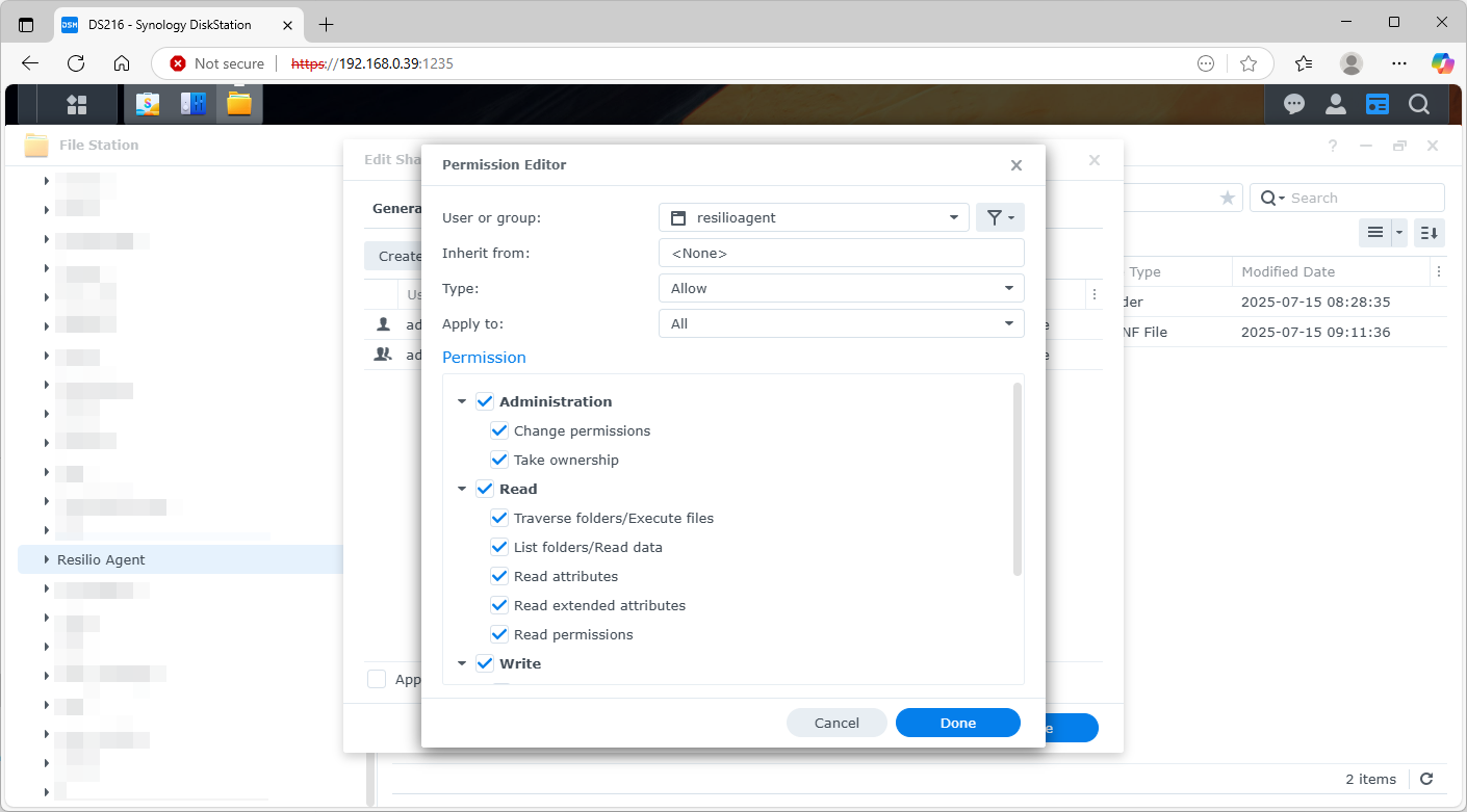 - In the File Station, locate and right-click the Resilio Agent shared folder, then click Properties.
