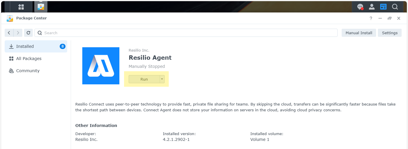 Once the agent has been successfully upgraded, click Run to start Resilio Agent.