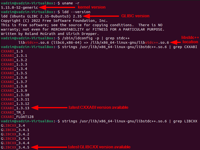 - GCC 5.1.0: GLIBCXX_3.4.21, CXXABI_1.3.9