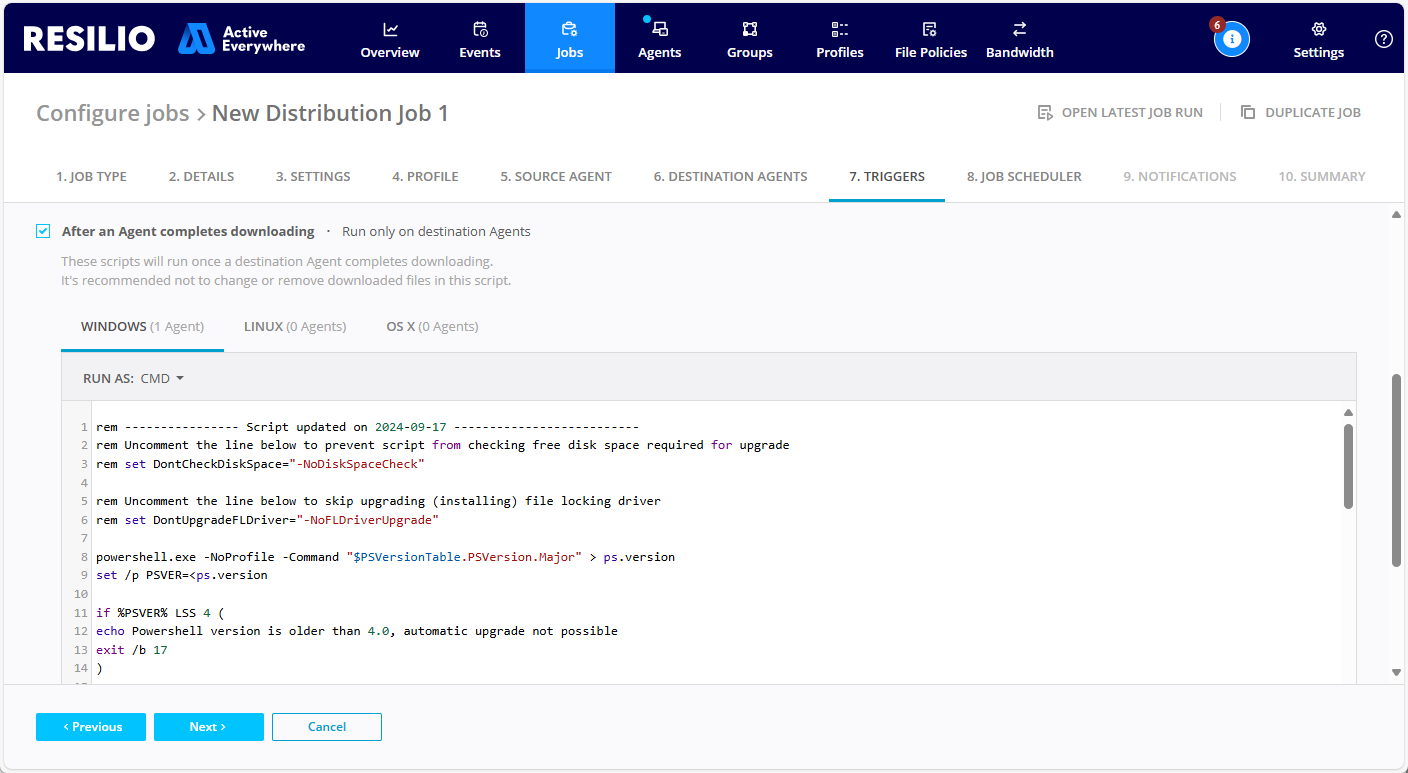 - Ensure to enable one of triggers "Run script when agent completes download" or "Run script when all agents complete download".