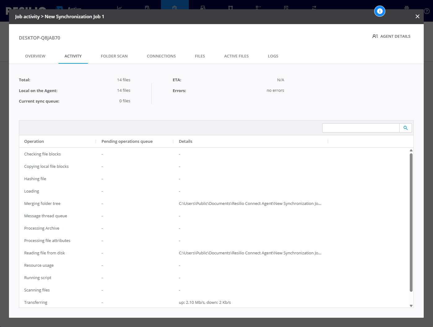 This table shows the Agents' activity, the number of pending operations (see below), and the details on each of the activities. Empty details imply that the current Agent operation is not being performed at the moment.