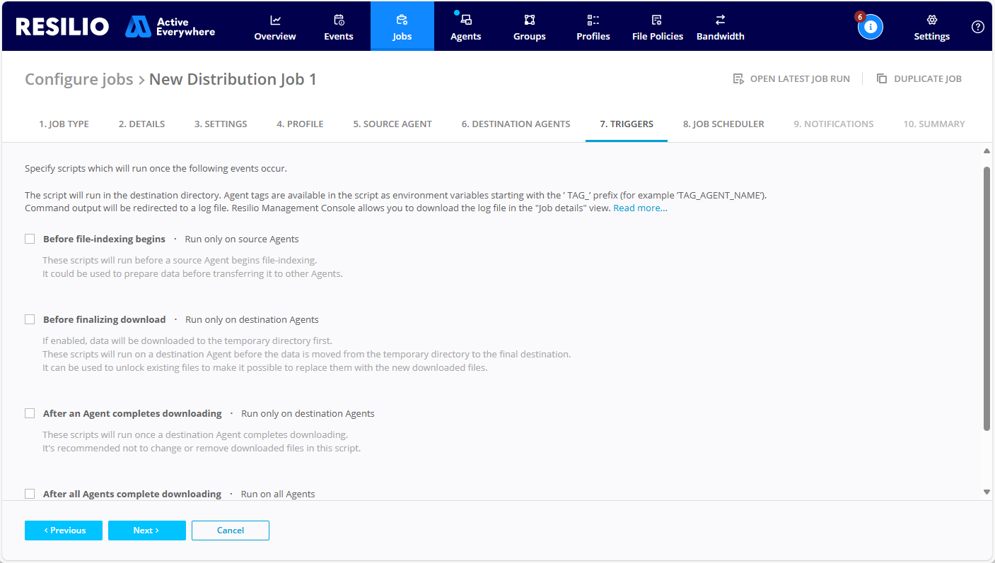 Important: We highly recommend not to remove or update the distributed files with scripts initialized by this trigger. Otherwise, the file will have to be re-downloaded from the source Agent. - After all agents complete downloading - The script initialized by this trigger is run on both the source and the destination agents, after all destination agents finish downloading files.