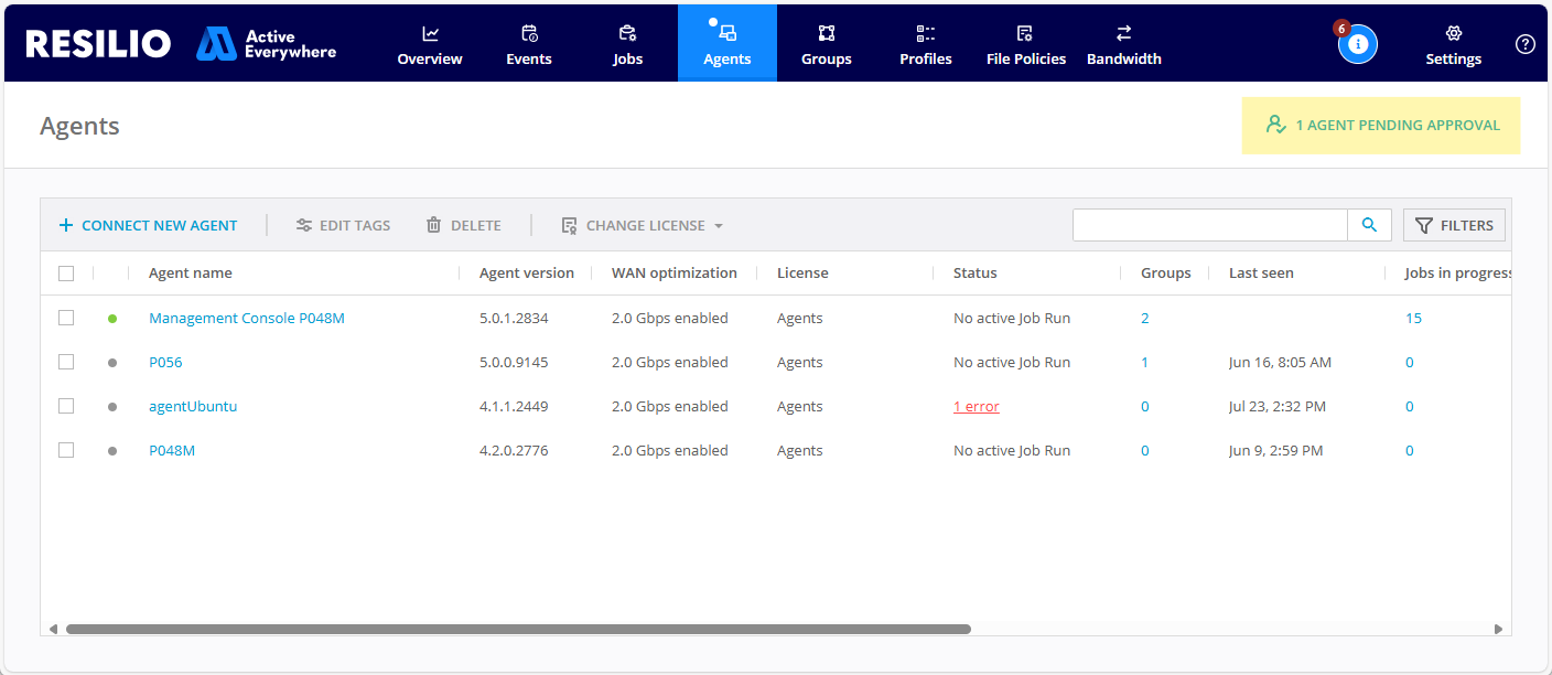 Starting with Resilio Active Everywhere v 2.8.0 new Agents that connect to Management Console without providing a valid bootstrap token, must be approved (or declined) by the Administrator. All users who have "Full Access" to Agents as per user Roles on the Management Console can also approve or decline.