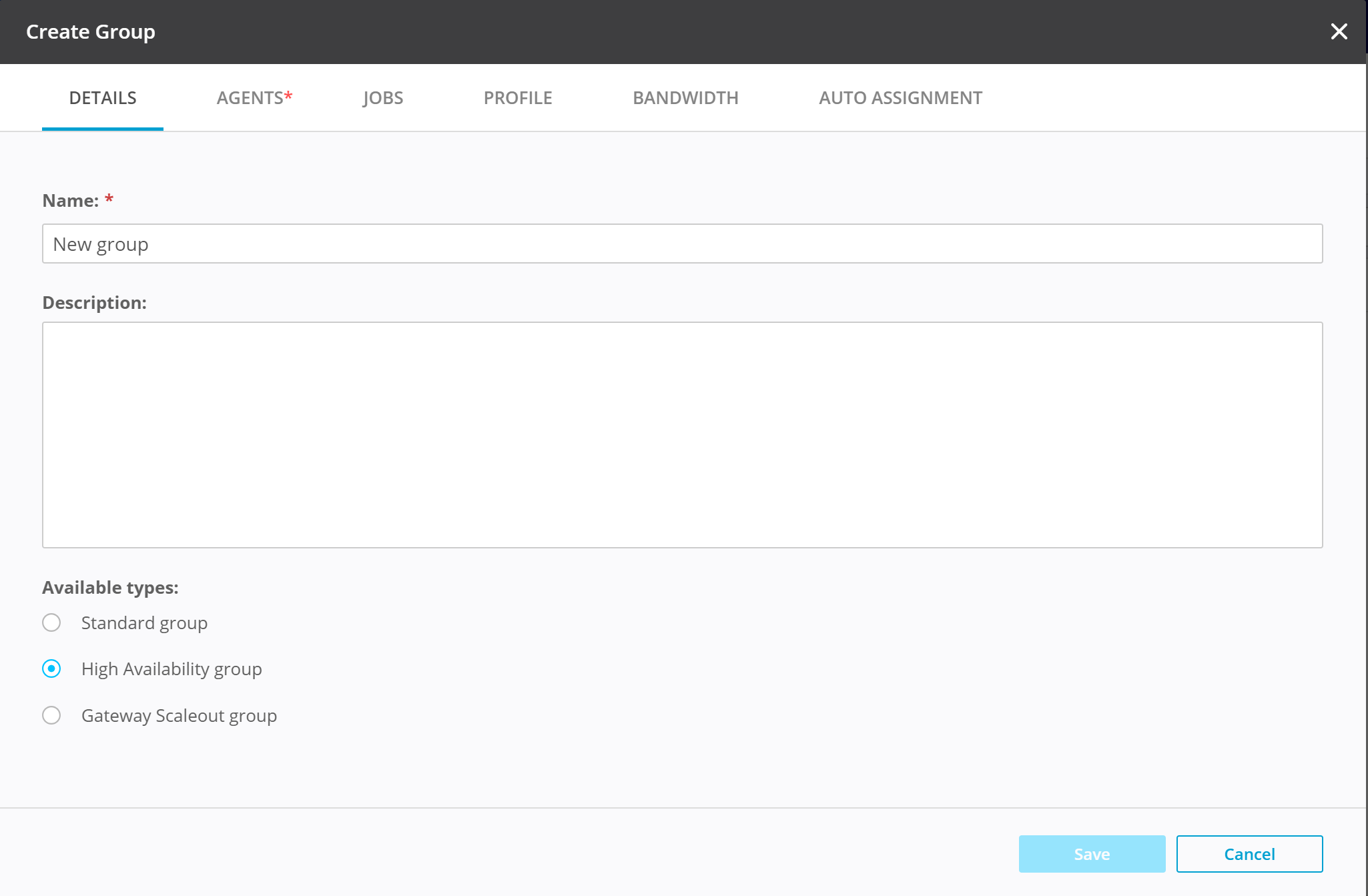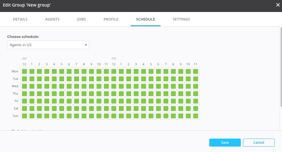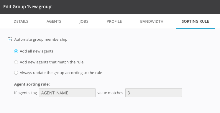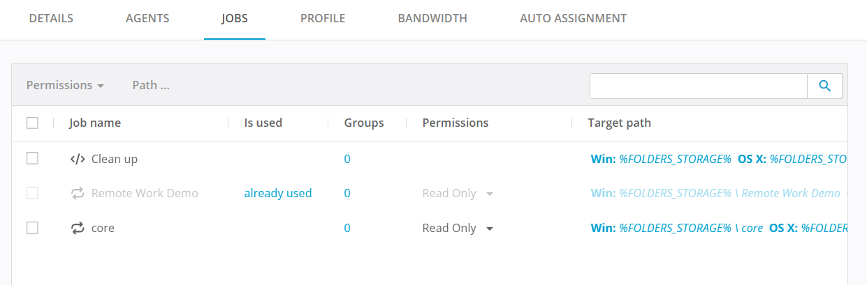 Allows to add or remove certain jobs for the group. Depending on the type of the group, Agents' OS and version, some jobs or job permissions may be restricted from being assigned to a group.