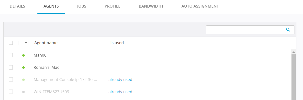 - If the agent you are trying to add already has the job with a permission different form that of the specified group, Resilio Management Console will display "already used" the "Is used" column and won't allow to add the conflicting Agent.