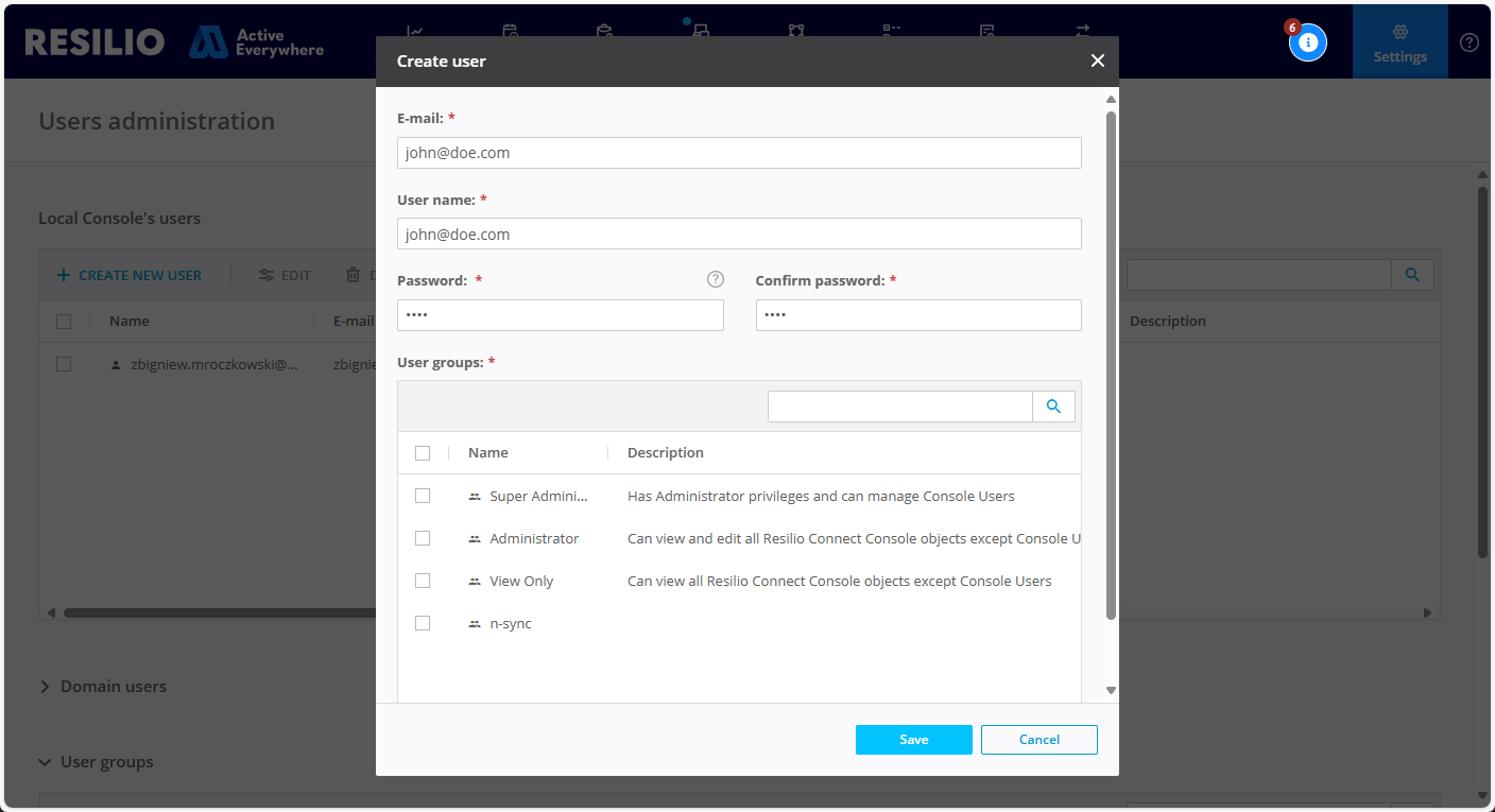 Each user must have at least one user role which defines their access level. If a user belongs to several groups, the user's resulting permissions are the sum of all the permissions from the groups. Starting with version 2.10 strong password is required.
