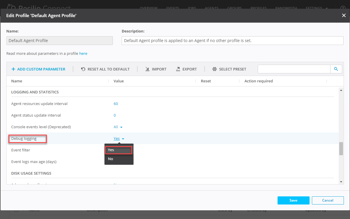 Open the Profile, switch "Debug logging" to "Yes" and save. The setting will be applies to all other Agents using this Profile.