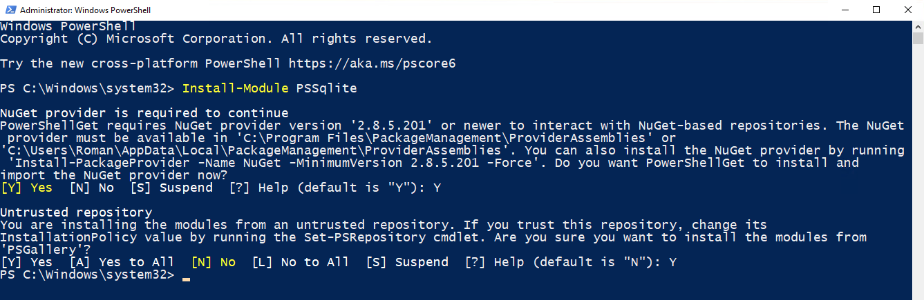 Install-Module PSSqlite, agree to install NuGet provider and confirm installation from the untrusted repository