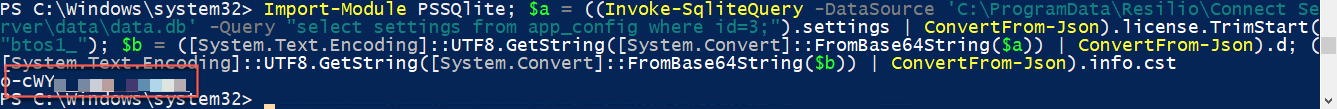 Import-Module PSSQlite; $a = ((Invoke-SqliteQuery -DataSource 'C:\ProgramData\Resilio\Connect Server\data\data.db' -Query "select settings from app_config where id=3;").settings | ConvertFrom-Json).license.TrimStart("btos1_"); $b = ([System.Text.Encoding]::UTF8.GetString([System.Convert]::FromBase64String($a)) | ConvertFrom-Json).d; ([System.Text.Encoding]::UTF8.GetString([System.Convert]::FromBase64String($b)) | ConvertFrom-Json).info.cst