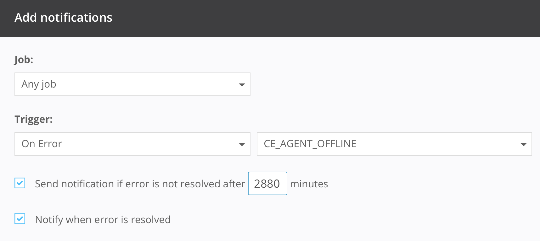 You can assign a notification for the "CE_AGENT_OFFLINE" error and set it to notify you via an e-mail only if the error is not resolved. Below is an example for setting this value to 2 days: