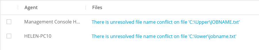 Agent is capable to resolve the conflict only to the extent of adding a ".Conflict" to the file's name. Recheck and resolution of conflicts is a disk-costly operation. It's disabled by default for pre-3.1.5 version in the Agent Profile. If "Resolve filename system conflicts" is disabled, the Agent will skip the file and report this error. The job won't reach its 100% completion.