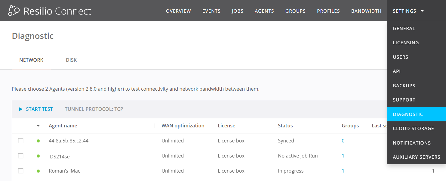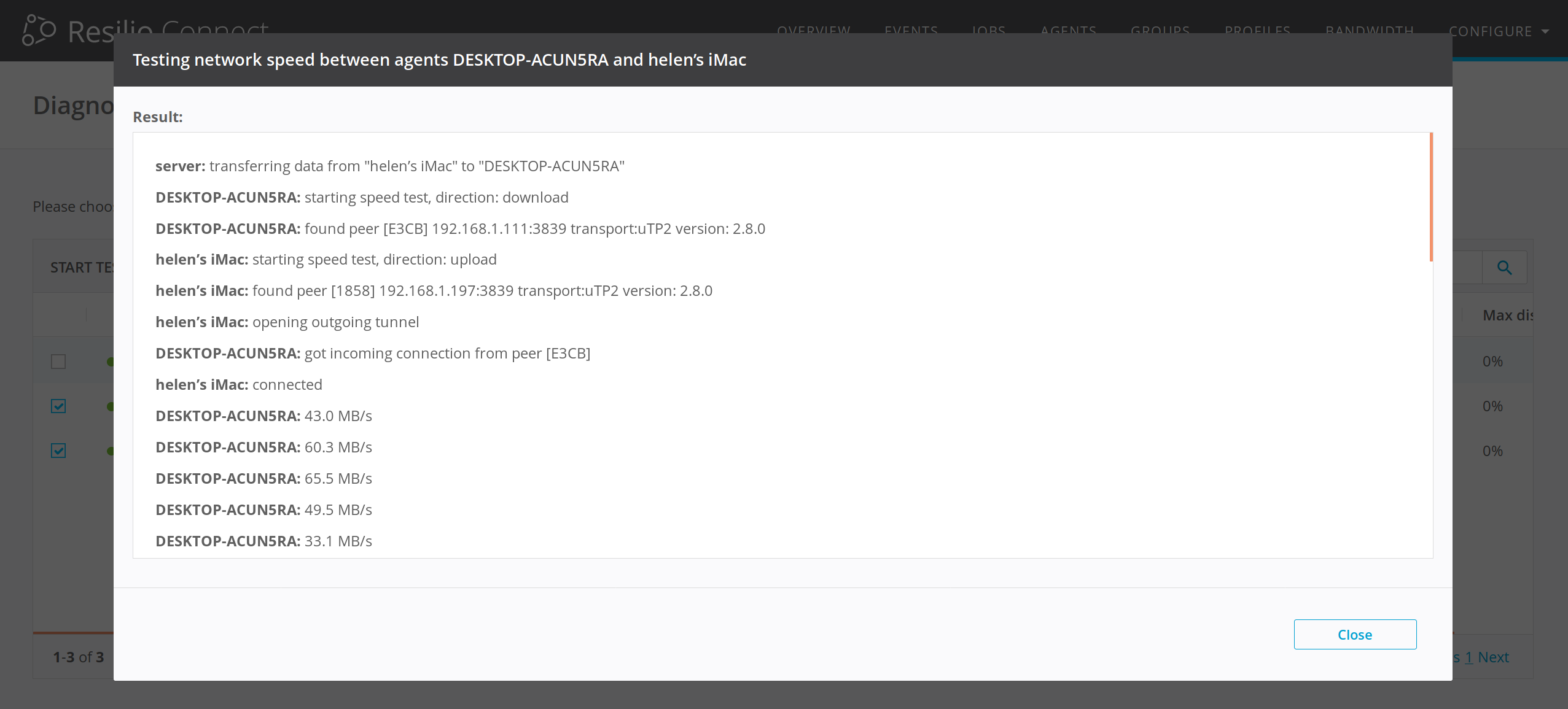 Starting with version 2.8.0, the Connect Management Console allows Administrators to test network bandwidth between specific agents. To start the speed test, go to the Configure -> Diagnostic tab.